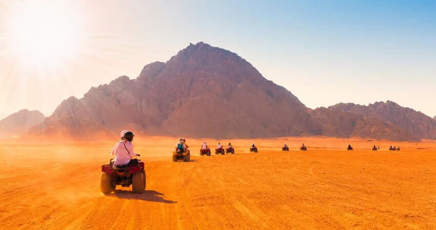 ATV SAFARİ TURU (GÜN BATIMI & ÇÖL MACERASI) Sharm El Sheikh’in büyüleyici çöl atmosferinde, adrenalin dolu bir serüvene hazır olun! 14:30 – 17:00 saatleri arasında gerçekleşen bu turda, sizi otelinizden alıyor ve heyecan dolu bir ATV deneyimine başlıyoruz. Otel konumuna göre saatlerde küçük değişiklikler olabilir. Çölün sessizliğinde ilerlerken, ses yankısı noktasında fotoğraf molası veriyoruz. Burada gün batımının altın tonlarıyla muhteşem kareler yakalayabilirsiniz. Ardından Bedevi çadırında geleneksel çay molası veriyor, bölgenin yerel misafirperverliğini hissediyoruz. Turun sonunda 5 dakikalık deve gezintisi ile çölün otantik atmosferini tamamlıyoruz. 4 yaşa kadar çocuklar için tur ücretsizdir. ATV Tur Ücreti: 35 USD ( Tek kişi) 50 USD (iki kişilik ) Tur Saatleri: 14:30 – 17:00 . Tura Dahil Olanlar: Otelden alma & otele bırakma, 1 saatlik ATV Safari, Çölde fotoğraf Molası, Bedevi çay ikramı, 5 dakikalık deve gezintisi, 4 Yaşa Kadar Ücretsiz Katılım, Alternatif Seçenekler: Buggy (1 kişilik araç): 50 USD Buggy (2 kişilik araç): 70 USD,Buggy (4 kişilik araç): 80 USD